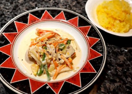 (しっとり鶏胸肉と野菜を爽やかなオレンジクリームソースで仕上げ、サフランライスと共に。)